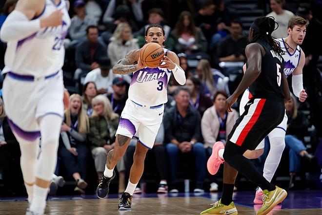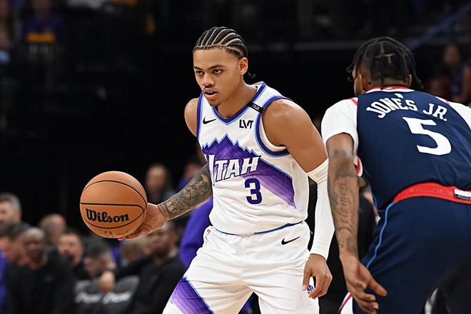 本场比赛中,爵士的先发控卫基扬特-乔治(Keyonte George)的表现还是相当不错的。乔治全场出场29分55秒,投篮12中6,三分线外7中1,罚球4中3,得到了16分2篮板9助攻2抢断的数据,还有3次失误和1次犯规,正负值也是达到了+18。乔治在进攻端虽然外线投篮手感不佳,但是他还是展现出了相当不错的突破能力和终结能力,他在传球和组织进攻方面的表现更是令人刮目相看,他有效串联起了球队的进攻,爵士的运转流畅,绝大多数球员也发挥出了自己的特点和价值。除此之外,乔治在防守端的表现也是值得肯定的,看起来他的个人防守能力也是有了一定程度的提升。最关键的是,乔治在场上没有乱打,他控制了自己的出手次数,做到了在投篮和传球方面的平衡,他的出色表现也是球队能够取得这样一场大胜的重要因素。